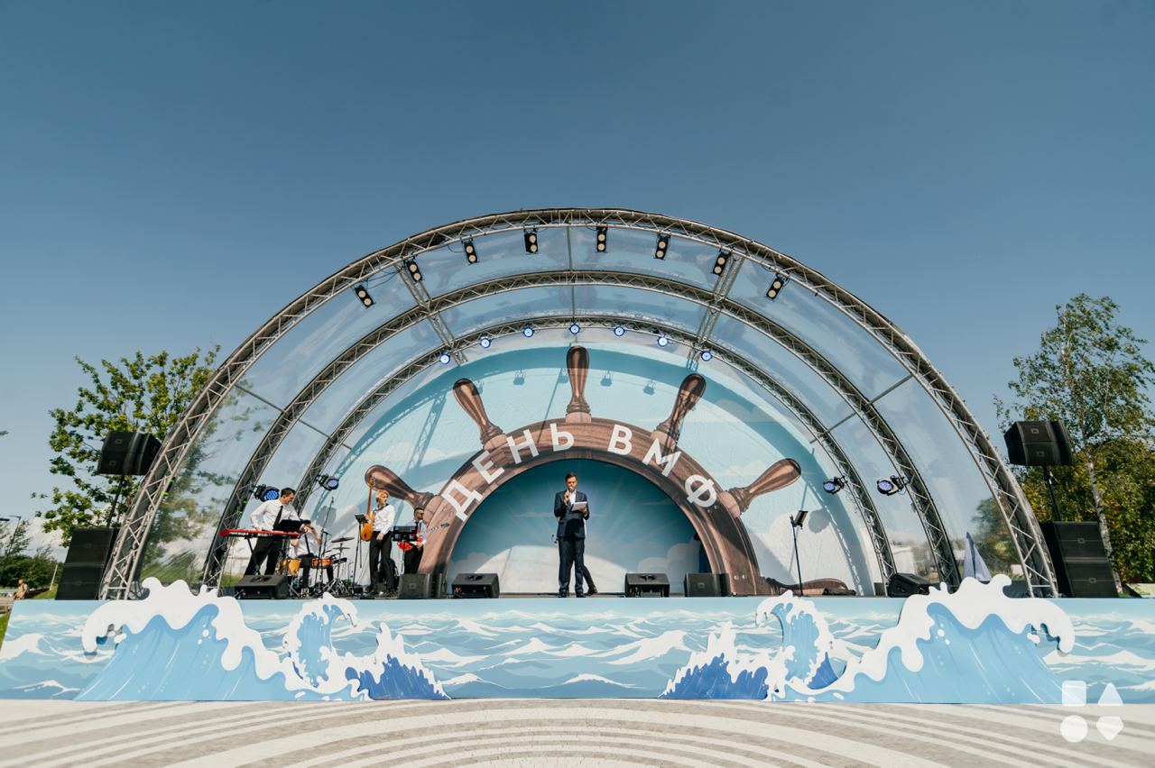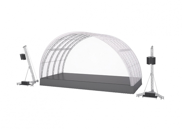 Радиальные фермы надежно интегрируются в сценический подиум Layher, формируя монолитную сцену, способную выдерживать порывы ветра до 150 км/час.